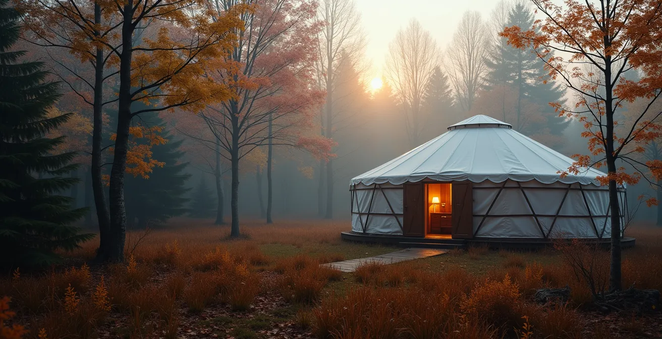 L’image d’une yourte douillette, blottie dans une forêt québécoise aux couleurs d’automne, fait rêver. On s’imagine le crépitement du poêle à bois, une boisson chaude à la main, déconnecté du quotidien. Pourtant, la réalité peut vite déchanter. Le premier contact avec l’air frais et humide en entrant, les vêtements qui peinent à sécher, cette sensation de moiteur persistante… Le séjour tant attendu peut se transformer en une lutte constante contre l’inconfort. Cette expérience, familière à de nombreux campeurs, n’est cependant pas une fatalité. Elle est le symptôme d’une approche inadaptée à cet habitat unique, d’origine mongole, bien différent d’une simple tente ou d’un chalet.